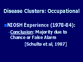 In fact, NIOSH concluded that the majority of these occupational disease clusters were due to chance or even a “false alarm.” Furthermore, as commented in the general disease cluster literature, considerable time and resources must be devoted to appropriately investigate a disease cluster. Therefore, the investigation of disease clusters in any scenario should not be undertaken lightly. |