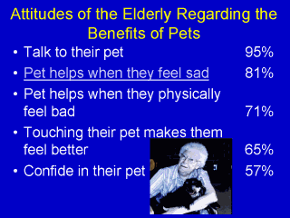 From New J, Wilson C, Netting F. 1986. How community-based elderly perceive pet ownership. California Veterinarian, Sept-Oct:22-27. Conclusion: Pets are an integral component of the social support network and family for many individuals and therefore, probably contribute to public health and well-being. Epidemiological studies are needed to measure the impact of pet ownership on human health. |