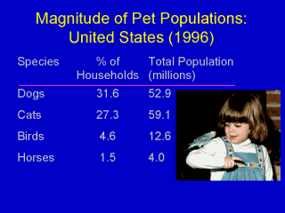 - The statistics for this slide and the following slide are from the American Veterinary Medical Association (AVMA), Center for Information Management. - 58.2 million (58.9%) of all U.S. households had a companion animal. - Households with children at least 6 years old were most likely to own pets. - Households with older, single persons were least likely to own pets. - Pet ownership increased as household income increased, with the exception of ownership of birds. - Home owners were more likely to own pets than persons who rent their dwellings. |