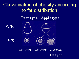 There are two types of body fat distribution, lower body (pear) or upper body (apple). The latter may be further divided into two types,one that is primarily visceral (intra-abdominal), the other mainly subcutaneous. Visceral fat type has greater risk for metabolic disorders than the subcutaneous fat type. |