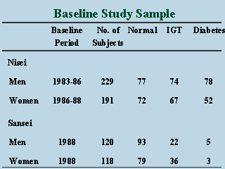 Our baseline study sample is shown in this slide. Between 1983 to 1988, 229 Nisei men, 191 Nisei women, 120 Sansei men and 118 Sansei women were examined. Glucose tolerance was defined by WHO criteria. |