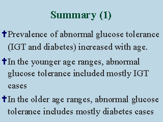 In summary, prevalence of abnormal glucose tolerance including IGT and diabetes increased with age among Japanese Americans. In the younger age ranges, most cases of abnormal glucose tolerance were IGT but in the older age ranges, most cases of abnormal glucose tolerance were diabetes. |