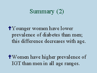 Prevalence of diabetes in women was lower than in men, but this difference between men and women decreased with age. In women, prevalence of IGT was higher than in men at all age ranges. |