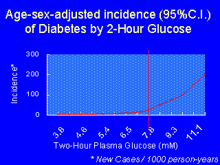 The next stage of development of Type 2 diabetes is the appearance of IGT. IGT is defined as that degree of glucose intolerance which is associated with a high risk for the development of Type 2 diabetes. The WHO criterion for IGT is a venous plasma glucose level of 7.8-11.0 mmol/l two hours after a 75g oral glucose load. |