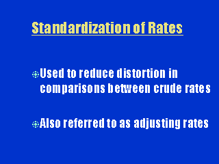 Although age-specific comparisons are meaningful, it is also desirable to compare overall mortality rates across population. Crude mortality rates are generally not comparable due to population differences in demographic characteristics that may influence that rate, as previously discussed. However, crude mortality rates can be standardized to reduce this distortion. This is also referred to as adjusting rates. |