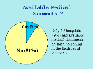 Available Medical Documents ? Only 19 (9.0%) hospitals/clinics investigated had available medical documents on sarin poisoning in the facilities at the event. |