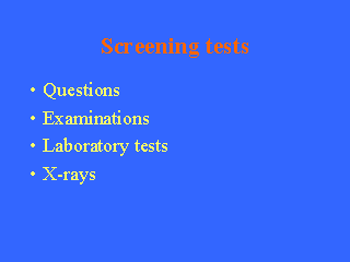 While screening is often equated with sophisticated technology, this is not always the case. Screening can be very simple tests, as simple as a set of questions. For example, the Michigan Alcohol Screening Test (MAST) is a set of questions that family doctors can use to identify individuals at risk of alcoholism. Physical examinations can be screening tests, checking blood pressure is one example. Laboratory and diagnostic imaging tests are commonly used for screening for disease. |