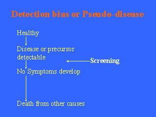 Detection of a disease precursor by screening in someone who would not ultimately develop symptoms or die from the disease leads to detection bias, or pseudodisease. For example, blood pressure screening leads to people with high blood pressure being told that they have hypertension. While people with hypertension are more likely to develop diseases such as stroke, not all of them will. These people can be considered to have a pseudodisease |