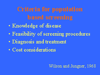 selective testing in people with symptoms or signs of disease. Wilson and Jungner proposed a set of screening criteria, in four broad groups in a report to the World Health Organization thirty years ago. These criteria remain relevant today. We will discuss each set in turn. |