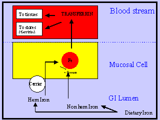 Mechanisms of Iron absorption Different mechanisms participate in the absorption of heme and non-heme Iron. Although iron can be absorbed along the intestinal tube, it is more effective at the duodenum level. Ionic iron (Fe +++ ) is reduced to Fe ++ by chloridric acid in the stomach. Non-heme Iron is delivered to the intestinal mucosa in an ionic form and it is taken across the brush border on a carrier protein by means of receptor mediated endocytosis. Heme Iron is absorbed intact mediated by an intestinal heme receptor. Once inside the intestinal cell, the iron is released by heme oxigenase. Ionic iron is a promoter of free radical reactions, which are toxic to living cells, so it binds to a protein in the intestinal cell. Iron binds to transferrin in the intestinal cell; when transferrin is saturated, the remaining iron is stored in the intestinal cell as ferritin. |