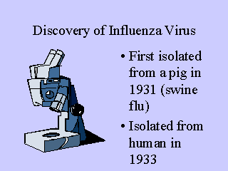 Influenza virus was first isolated from pigs in 1931 by Shope. This swine virus is antigenically related to the influenza virus isolated by Smith, Andrewes and Laidlaw in 1933. It is of historical note that the virus was isolated from a specimen obtained from C. H. Andrewes himself. Both these viruses are antigenically similar (same serotype) and are serologically related to the influenza virus that caused the 1918 pandemic. |