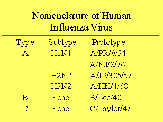 There are three subtypes of influenza A virus, H1N1, H2N2 and H3N2. Prototype virus is named according to type of virus, where the virus was isolated, specimen number and year. For example, A/PR/8/34 indicates that the virus was type A, isolated from specimen number 8 obtained from a patient in Puerto Rico in 1934. This is a specific strain of influenza virus. A/Japan/305/57 was isolated in Japan from specimen number 305 during the Asian flu pandemic in 1957. |