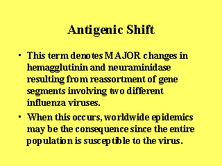 When antigenic shift occurs, there is emergence of a new SEROTYPE. Infections with the previous serotype do not provide immunity to the new virus. The occurrence of antigenic shift is irregular, relatively infrequent, and unpredictable. |