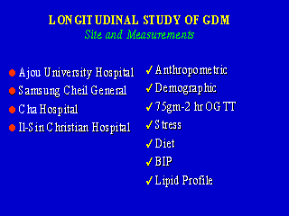 Since GDM patients are at an increased risk for DM, we designed a prospective study to evaluate the risk factors for later DM. It is a multi-center prospective study and 4 major tertiary and university hospitals are participating in the study. In this epidemiologic study, anthropometric measurements, demographics, OGTT, stress tests, dietary evaluation, bioelectric impedance tests, and the lipid profiles were standardized at each center. |