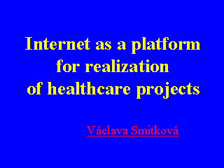 to the most characteristic phenomenon of the end of our century. Many things could be mentioned - and should be mentioned - about the usage of Internet for medical purposes. In my first lecture I concentrated on the Internet information sources for healthcare domain from the librarian point of view. Now I would like to show you how the Internet can be used as an information platform for realization of healthcare projects.