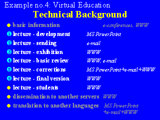 one lecture for the virtual course accessible via WWW. First information was sent to several medical electronic conferences and also appears on the Web pages of the University of Pittsburgh. Then teacher prepared the lecture in Microsoft PowerPoint software including slides with pictures or/and text, comments and Web references. Then the lecture was sent by e-mail to Pittsburgh. The conversion from MS PowerPoint to html format was done and the lecture was put up to the WWW. Then a group of reviewers made a basic review, sent suggestions to the author and he/she made the corrections.