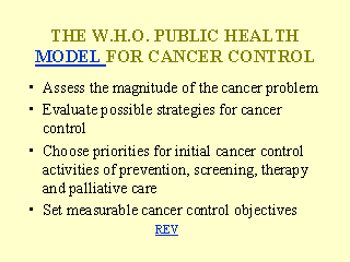A cancer control program is like a chair with four legs, a seat and a back. The four legs represent the interventions or programs of prevention, screening, treatment and palliation. The seat joins the four legs into a functional chair. It represents the organizational structure, management and governance of a national cancer control program that integrates its four programs into a functional unity. The back of the chair provides support. Here it represents the infrastructure that needs to be in place for the four programs to function.