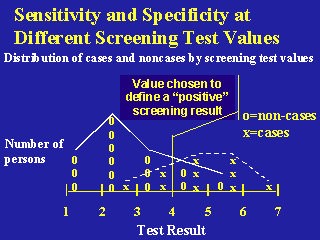 The test value chosen to define a "positive" screening result determines sensitivity and specificity.