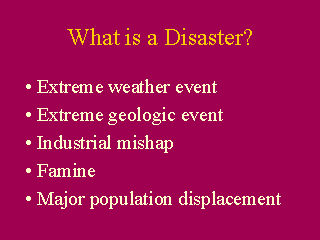 and the term may mean different things to different people. - Disasters may represent many different types of events. Those related to weather and the earths geology are the most widely recognized. Recent events, though, point out that several episodes of mass destruction have their links to our own actions. These may include industrial accidents, many episodes of famine, and significant population displacements. - The common characteristic to each of these events is their severity. These events represent extremes. We normally live with the underlying features of these events present with us every day. They become disasters when the extremes express themselves. |