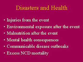 ability to feed the population affected adequately. - It is quite common to hear many individuals raise the issue of an increased risk for communicable diseases following a disaster. Certainly, the environment may be right for a disease outbreak to occur. However, several reports suggest that this risk is generally over-estimated. - Another area of interest is the mental health consequences of disasters. It is not uncommon for some victims of disasters to experience what is called disaster syndrome. The specific nature and pattern of this syndrome is not well defined. Most often the term is used to describe the segment of the population affected by depression and other mental health conditions arising from the disaster. - Recent studies also suggest that mortality from NCDs may be increased in the period of time following a disaster event. |