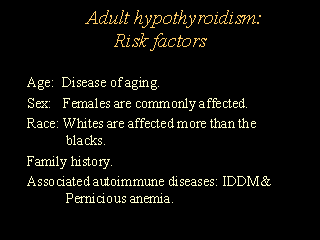 reserve by the pituitary gland. -Female to male ratio ranges from 2:1 to 8:1 in various epidemiologic surveys which reflects the high prevalence of autoimmune diseases in the female population. .1:4000 white infants and 1:30,000 black infants are affected.The cause is unexplained -Hashimotos thyroiditis, the most common cause in North America, runs in families (autoimmune disease). - Associated with other autoimmune diseases e.g, IDDM and pernicious anemia. |
