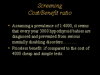failure have to be recognized. They can be divided into two main categories:technical errors and patients who had normal values at the time of the screening "Delayed TSH rise". Together they account for 3:100,000 newborns, that is 1:8 diagnosed babies. Thus, the pediatrician must be alert to the presence of signs and symptoms of the disease even if diagnosis of the hypothyroidism has not been made by screening test. |