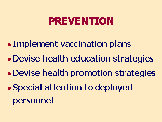 immunization plans, which are especially important in the military. The military provides a good opportunity to educate young people about disease prevention and to encourage them to adopt proper health habits. For example, some soldiers start smoking while in the military. The trick here is to get the commanders involved in the preventive effort, as soldiers of all ranks tend to follow the examples set by commanding officers. Special consideration must be given to prevention of disease among deployed troops, and many militaries have some form of consultation service for this purpose (see slide 19 - Travel Medicine).