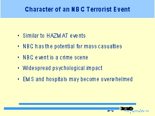 In many respects, an NBC terrorist attack is a HAZMAT incident with the potential for mass casualties (possibly thousands) and a crime scene all in one. There would be widespread psychological impact, and EMS and hospitals may become overwhelmed. Policies and procedures should be developed, exercised, and followed to ensure a safe and effective emergency response.