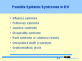After a characteristic incubation period following aerosol exposure, most BW agents present as an initial influenza syndrome with fever, chills, malaise, headache, and myalgia. Some BW agents rapidly develop into a pulmonary syndrome with dyspnea, cyanosis, chest pain, and radiological abnormalities. Liver involvement is indicated by rising liver enzymes, with or without jaundice. Encephalitis may occur with some select viral agents, typified by photophobia, confusion, nuchal rigidity. Maculopapular, vesicular pustular, or ulcerative skin lesions with or without bleeding abnormalities may occur with some agents. Unexplained death or flaccid paralysis may be indicative of the use of biological toxins.