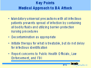 - The only means of limiting the continual spread of any infectious agent is by self-protection, following universal wound and blood precautions, and decontaminating patients as necessary. Therapy should be initiated for what is treatable, including the use of broad-spectrum antibiotics, such as ciprofloxacin.