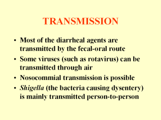 | Food and water contaminated directly or indirectly with feces or vomitus of infected persons are the principal mode of transmission. Ingestion of raw or inadequately cooked seafood or eating shelfish from coastal and estuarine waters can cause outbreaks of diarrhea. Person-to-person transmission occurs by hand-to-mouth transfer of the agent from feces of an infected individual. Respiratory spread is possible for rotavirus. |