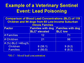 Demonstration of an elevated blood lead concentration (BLC) in a family dog increased the probability sixfold of finding a child in the same family with an elevated BLC.* Thirty-eight percent of families with dogs having an elevated BLC also had a child with an elevated BLC compared with only 9% of families with dogs having a low BLC. The clinical signs of acute lead toxicity in children and dogs are similar. *Thomas, CW., et. al. Blood lead concentrations of children and dogs from 83 Illinois families. J Amer Vet Assoc, 169(11):1237-40, 1976. |