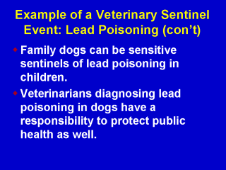 The following were the author’s conclusions based on the results of a study reported in 1976 comparing blood lead concentrations of children and dogs in 83 low-income suburban Illinois families. These conclusions are still valid in 2000. 1) The most likely sources of exposure to lead in the environment for both dogs and children, are lead based paint and soil contaminated with lead. A history of pica (eating non-food substances) increases the likelihood of lead exposure in both species. A dog with a BLC of diagnostic significance indicates probable lead contamination in the home environment. Children who share this environment are expected to be similarly exposed. 2) A veterinarian who diagnoses lead poisoning in a family pet has a responsibility to report this exposure to a local public health agency. If there are children in the home, they can be screened for lead poisoning and corrective action taken, if necessary. |