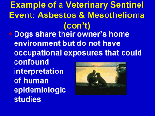 Results: An asbestos-related occupation or hobby of a household member and use of flea repellents on the dog were significantly associated with mesothelioma. In addition, there was a trend indicating an increased risk of mesothelioma with an urban residence. Lung tissue from three dogs with mesothelioma and one with squamous cell carcinoma of the lung had significantly higher concentrations of chrysotile asbestos fibers than lung tissue of age-matched control dogs that died of non-pulmonary related causes. These findings confirm that asbestos exposure is a risk factor for mesothelioma in the dog, as it is in humans.