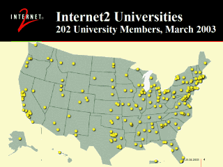 | This is the latest map of Internet2 universities. Each Internet2 university commits to providing the high performance networking on their own campus, connecting to a high-performance backbone network, and supporting advanced applications development on their own campus. |