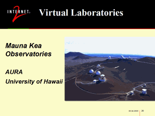 various applications already in use: 1) the Upper Atmosphere research Collaboratory (UARC) developed at the University of Michigan--allows researchers access to data from instruments in Greenland w/o having to travel there, and allows them to discuss and interact in real time. This applications allows access to broader audience, including the second-order affect of enabling graduate students (who would never have been able to go to Greenland) to look in on research. |
