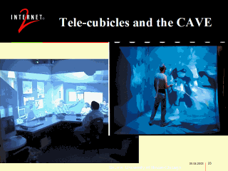| Tele-cubicles and CAVEs are different interfaces used for some advanced applications. Immersion in a virtual world, or interaction among people using these interfaces allows people to interact with applications in new ways. The requirements of network applications using these kinds of displays generally require advanced networking. |