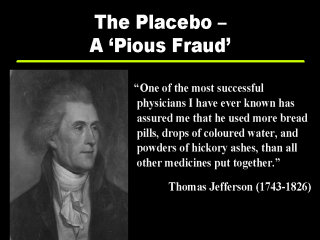 | Now, this is not new, and Thomas Jefferson talked about practices of his day in this fashion. He said, “One of the most successful physicians I have ever known has assured me that he used more bread pills, drops of colored water, and powders of hickory ash than all other medicines put together” -- which at that time was a good thing. |