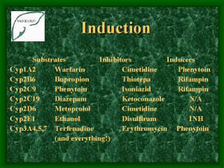 | Induction: Phenytoin with erythromycin (K Bachman et al, Single dose phenytoin clearance during erythromycin treatment. Res Commun Chem Pathol Pharmacol, 46:207, 1984) This report underscores the fact that the induction process takes some time; therefore single dose therapy seems to be permissible!) Cimetidine with fluconazole (surprise! Although one would predict an interesting interaction because of the cyp enzymology since they are both potent inhibitors of Cyp2C9, the predominant interaction is because of absorption! RA Blum et al, Increased gastric pH and the bioavailability of fluconazole and ketoconazole. Ann Intern Med, 114:755, 1991) |