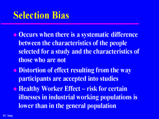 association between exposure and outcome is produced. Sometimes people we want to study may not be available for study. This can happen in an occupational setting where the exposed workers suffering symptoms are the ones we would like to study, but may have left their jobs. Those who remain are the ones less affected. Healthy worker effect – those severely ill or disabled are ordinarily excluded from employment. |
