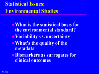 are defined to protect a sensitive subpopulation. How these standards are measured affects policy, enforcement and response. For example, manufacturers may get around regulations to reduce mass by increasing the number of ultrafine particles instead. G. van Belle emphasizes the need, when it comes to looking at environmental problems, to distinguish between variability (i.e., geographic distribution of PCB levels) vs. uncertainty (precision of the estimates of the levels). Ideally, we should use only the data we need to answer our research questions. However, given resource restraints we sometimes end up using available data sources which may not necessarily be always suitable for answering our research questions. Because such data were collected for other purposes, data fields may be different from what we want to know. Need to know the nature of the data in the database - the metadata. Biomarkers have not lived up to the original intent. Distinctions need to be made as to whether they are biomarkers of exposure, disease mechanism, or effect, since they serve different scientific purposes. Biomarkers of exposures and mechanisms have been found to be poor surrogates for clinical outcome. |