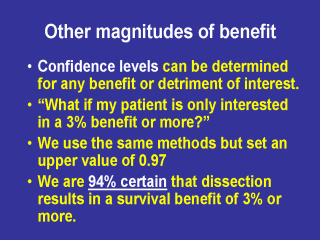 Confidence levels can be determined for any benefit or detriment of interest. “What if my patient and I are only interested in a 3% survival benefit or more?” We use the same methods but set an upper value of 0.97 We are 94% certain that dissection results in a survival benefit of 3% or more. |
