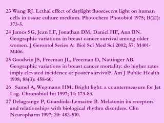 zones. Aviat Space Environ Med 2002; 73(10): 953-63. 29 Sturgeon SR, Schairer C, Gail M, McAdams M, Brinton LA, Hoover RN. Geographic variation in mortality from breast cancer among white women in the United States. J Nat Cancer Inst 1995; 87. 30 Barrett RK, Takahashi JS. Lability of circadian pacemaker amplitude in chick pineal cells: a temperature-dependent process. J Biol Rhythms 1997; 12(4): 309-18. 31 Zatz M, Lange GD, Rollag MD. What does changing the temperature do to the melatonin rhythm in cultured chick pineal cells. Am J Physiol 1994; 266(1 Pt 2): R50-8. 32 Moyer RW, Firth BT, Kennaway DJ. Effect of constant temperatures, darkness and light on the secretion of melatonin by pineal explants and retinas in the gecko Christinus marmoratus. Brain Res 1995; 675(1-2): 345-8. 33 Medina-Leendertz S, Valero N, Chacin-Bonilla L, Anez F, Giraldoth D, Arias J, Espina G, Diaz S, Bonilla E. High intensity light increases olfactory bulb melatonin in Venezuelan equine encephalitis virus infection. Nerochem Res 2001; 26(3): 231-4. |
