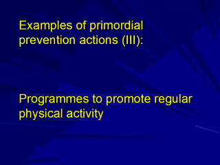 | Physical activity programmes should be based on policy, public information, education and training supported by standardized research and evaluation components. All strategies should aim at increasing physical activity in the population as a whole with special emphasis on children and women. |