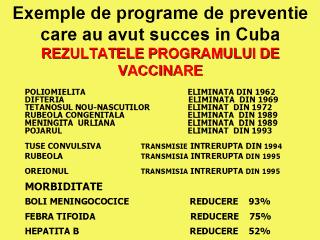 Sistemul de sanatate din Cuba este universal, liber si accesibil, cu un mare accent pus pe preventie si distribuirea informatiei. In ultimele decenii, Cuba a atins o crestere semnificativa a sperantei de viata si o reducere semnificativa a mortalitatii materne si infantile. Aproape toate aceste realizari pot fi atribuite activitatilor de preventie. Diapozitivul prezentat arata realizarile programelor de vaccinare in Cuba. Realizari similare pot fi observate in multe alte tari, incluzand Suedia, Finlanda si unele zone ale Indiei. In mod evident in ultima jumatate a secolului preventia are inca un impact pozitiv in cele mai multe tari. Autor: Peter G. Bourne, Cuba Sanatatea publica in Cuba |