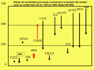 Ratele de mortalitate din cauza bolii coronariene la barbatii din mediul rural cu varste intre 35-74, 1970 and 1993 (Rate/100.000) Diapozitivul prezentat arata ca fostele tari din Uniunea Sovietica, spre deosebire de multe altele, au inregistrat cresteri ale ratei mortalitatii cauzate de boala coronariana. Principalul motiv pentru aceasta tendinta este prabusirea sistemului de sanatate publica din fosta Uniune Sovietica. Sursa: NIH, SUA: Statele Unite, AUST: Australia, CAN: Canada, CHN: China, FIN: Finland, FRAN: Franta, HK: Hong Kong, NZ:Noua Zeelanda, ITA: Italia, JPN: Japan, SING: Singapore, SCOT: Scotia, SPN: Spania http://www.pitt.edu/~super1/lecture/lec4091/006.htm Dr. Ueshima, Profesor si Presedinte, Department of Health Science, Shiga University Medical Science, Japan |