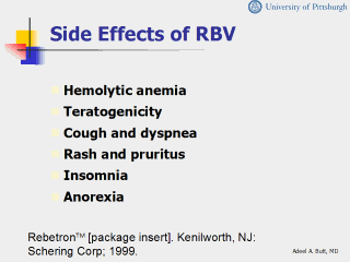 therapy is associated with certain side effects, including Combination IFN/RBV therapy, however, has been found to be relatively safe and consistent with the safety profile of each agent when used alone. Use of the 2 agents in combination is not believed to result in an increase of adverse effects. References Maddrey WC. Safety of combination interferon alfa-2b/ribavirin therapy in chronic hepatitis C-relapsed and treatment naïve patients. Semin Liver Dis. 1999;19(suppl 1):74. Rebetron ä [package insert]. Kenilworth, NJ: Schering Corp; 1999. |