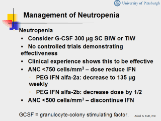 to therapy. Neutropenia is a relatively common occurrence in HCV-infected patients who are receiving PEG IFN alfa-2a plus RBV. In the past, the primary management of neutropenia was dose reduction, after which neutrophil counts quickly improve. The more recent findings of the importance of adherence to therapy have led to the consideration of the use of G-CSF to maintain the absolute neutrophil count (ANC) above 750, thus obviating the need for dose reduction. No studies have demonstrated that supportive therapy with G-CSF will result in dose maintenance and SVR. Current recommendations include dose reduction of IFN when ANC declines to less than 750. Because neutropenia increases the risk for infection, it is important that all HCV-infected patients are vaccinated annually against the flu and practice good health habits, such as hand washing, etc. References National Institutes of Health Consensus Development Conference Statement. Management of hepatitis C: 2002. Bethesda, Md: National Institutes of Health; June 10-12, 2002. Fried MW. Side effects of therapy and management. National Institutes of Health Consensus Development Conference Statement. Management of hepatitis C: 2002. Bethesda, Md: National Institutes of Health; June 10-12, 2002. Abstract. PEGASYS® Complete Product Information. Nutley, NJ: Hoffman-La Roche Inc; 2002. |
