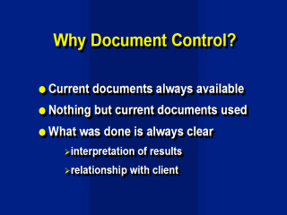 An important purpose of document control is to provide an accurate historical record. For example if a modification is made to a laboratory method, it is important to know the date on which the modification took place.