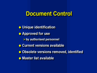 Immediate removal of obsolete versions of documents, so that they cannot be accidentally used, is integral to document control. One copy is marked obsolete and retained for archiving purposes, the remaining documents are destroyed.